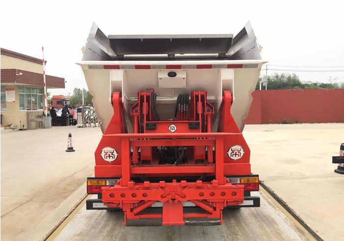 2.垃圾桶自動升起倒入箱體,落下垃圾桶,刮板開始刮料。采用后裝刮板壓縮技術,對生活垃圾大幅度壓縮減容。箱體頂部裝有刮板,在壓縮過程中,推板在推板油缸的作用下,向后進行壓縮垃圾。由于刮板設計與箱體底板有小間隙,保證垃圾進料干凈、壓縮實在,從而加大垃圾裝載量。壓縮比可達1:1.5以上,生活垃圾經壓縮后可達到500~700Kg/m3以上。