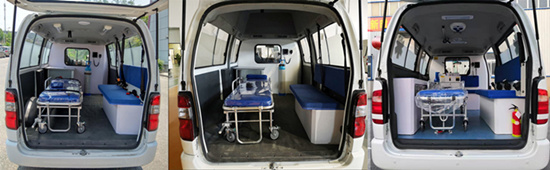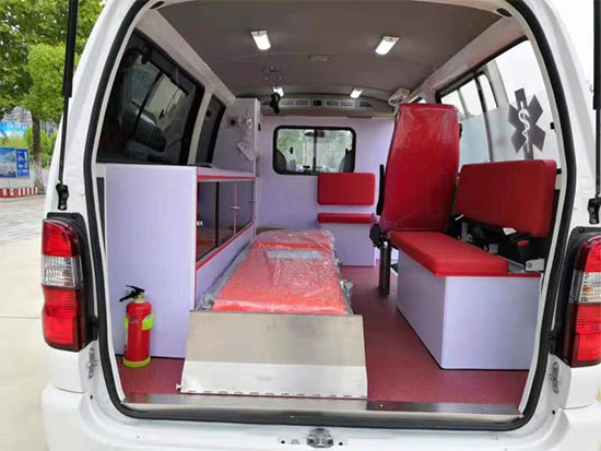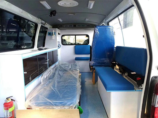 醫(yī)療艙內(nèi)部鋪裝了醫(yī)療專用地板革、中隔斷墻、配備診療工作臺及醫(yī)藥柜、集中供氧系統(tǒng)、暖風、空調,輸液架、 自動上車擔架、、柜式順排座椅、醫(yī)生單人座椅。