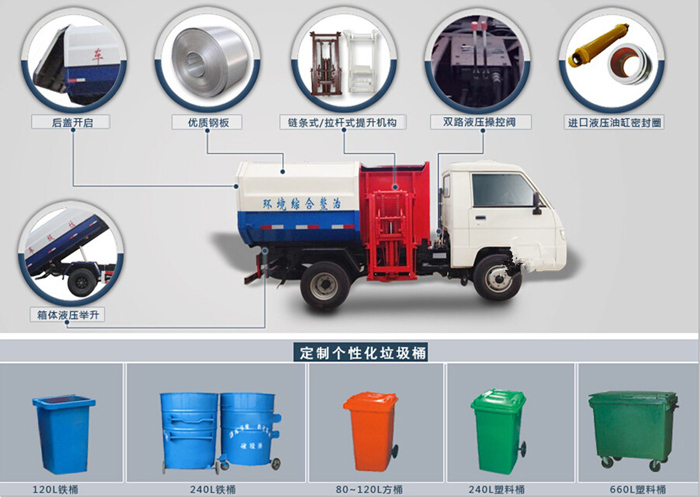 側(cè)裝掛桶式垃圾車的特點是一個車能配幾十個垃圾桶,能實現(xiàn)一臺車與多個垃圾桶聯(lián)合作業(yè),循環(huán)運輸,充分提高了車輛的運輸能力,特別適用于短途運輸,如環(huán)衛(wèi)部門對城鎮(zhèn)垃圾的清理、運輸?shù)?。同時,掛桶垃圾車還可以加裝其它功能,形成其它多功能掛桶垃圾車,如:掛桶壓縮式垃圾車、掛桶式泔水垃圾車、掛桶式對接垃圾車等。